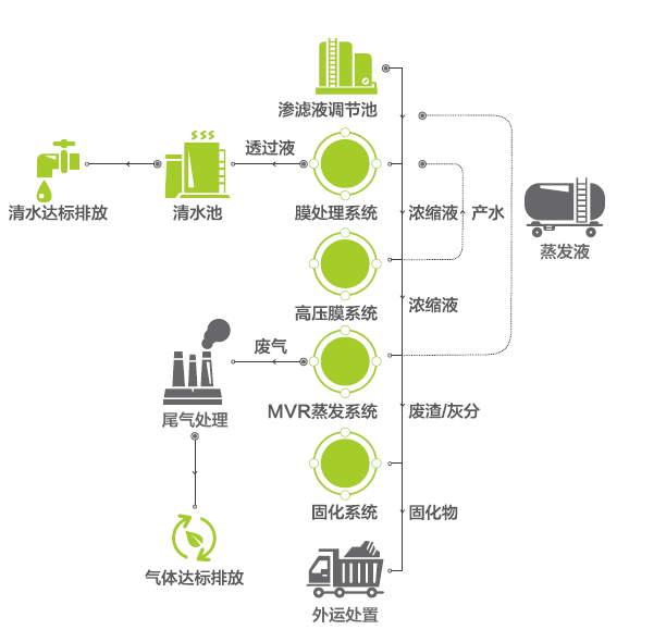 采用高压DTRO膜分离工艺及MVR蒸发工艺,均为行业领先工艺,彻底解决垃圾渗滤液浓缩液处理的难题,从而实现垃圾渗滤液处理近零排放的目标。